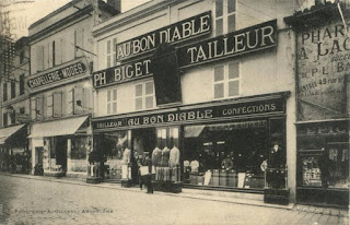 La seconde vue nous montre le même immeuble dans son état récent ; on y vend toujours des vêtements, mais sous l'enseigne du Pont Neuf. Notre lecteur nous informe qu'une enseigne d'obésification massive (burger king) vient de racheter les lieux...
